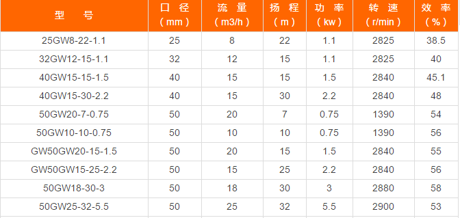 GW型管道排污泵性能選型