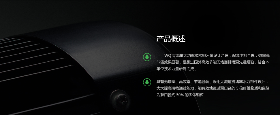 WQ大流量大功率潛水排污泵適用于工廠商業(yè)嚴(yán)重污染廢水的排放、住宅區(qū)的污水排污站、城市污水處理廠排水系統(tǒng)、人防系統(tǒng)排水站、自來(lái)水廠的結(jié)水裝置,醫(yī)院、賓館的污水排放、市政工程建筑工地、勘探、礦山配套附機(jī)、農(nóng)村沼氣池、農(nóng)田灌溉等行業(yè),輸送帶顆粒的污水、污物,也可用于清水及帶腐蝕性介質(zhì)。