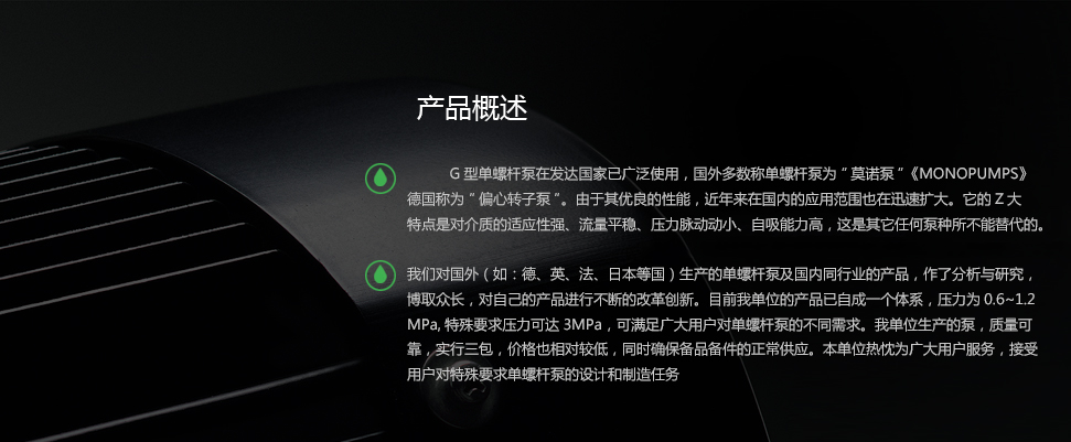 G型鑄鐵單螺桿泵在發(fā)達(dá)國(guó)家已廣泛使用,國(guó)外多數(shù)稱單螺桿泵為“莫諾泵”《MONOPUMPS》,德國(guó)稱為“偏心轉(zhuǎn)子泵”。由于其優(yōu)良的性能,近年來(lái)在國(guó)內(nèi)的應(yīng)用范圍也在迅速擴(kuò)大。