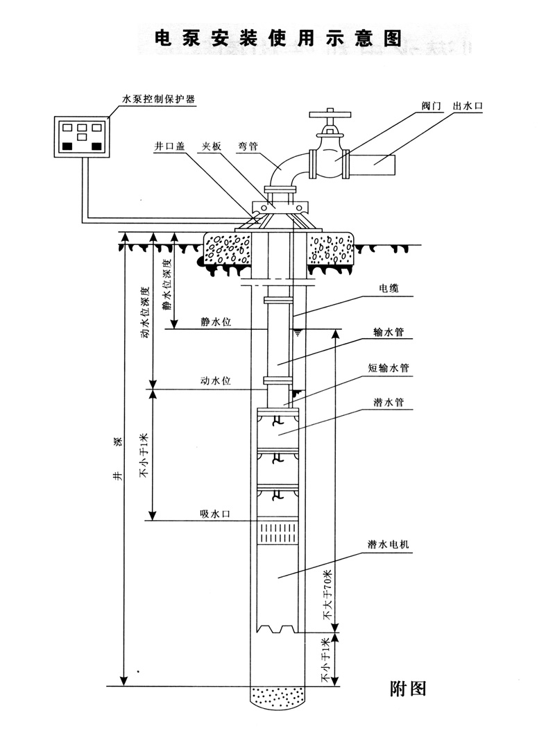 1.QJ型深井潛水泵機(jī)組由:水泵、潛水電機(jī)(包括電纜)、輸水管和控制開(kāi)關(guān)四大部分組成。潛水泵為單吸多級(jí)立式離心泵:潛水電機(jī)為密閉充水濕式、立式三相鼠籠異歩電動(dòng)機(jī),電機(jī)與水泵通過(guò)爪式或中.鍵筒式聯(lián)軸器直接;配備有不同規(guī)格的三芯電纜:起動(dòng)設(shè)備為不同容量等級(jí)的空氣開(kāi)關(guān)和自耦減壓起動(dòng)器、輸水管為不同直徑的鋼管制成,采用法蘭聯(lián)接,高揚(yáng)程電泵釆用閘閥控制。