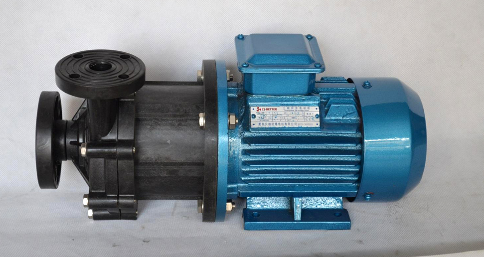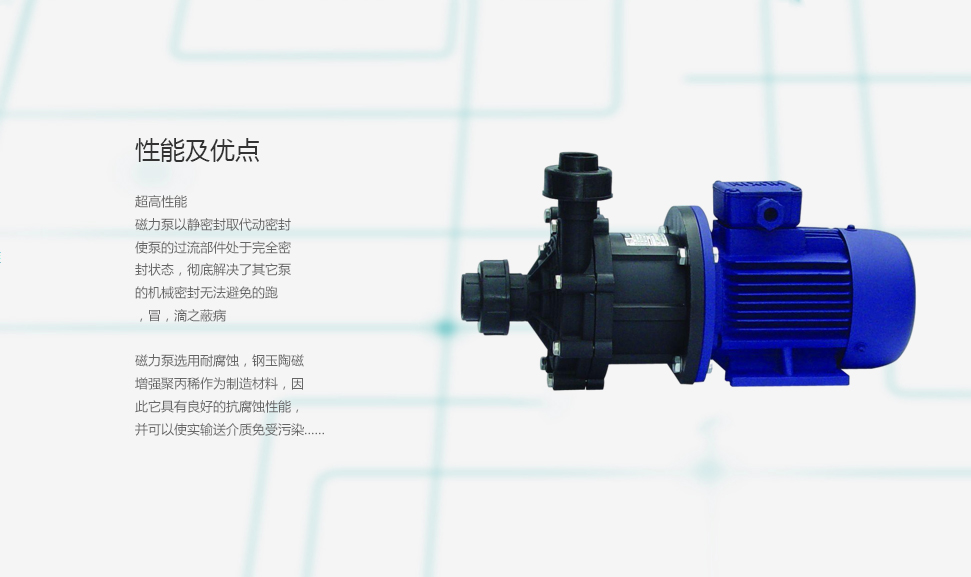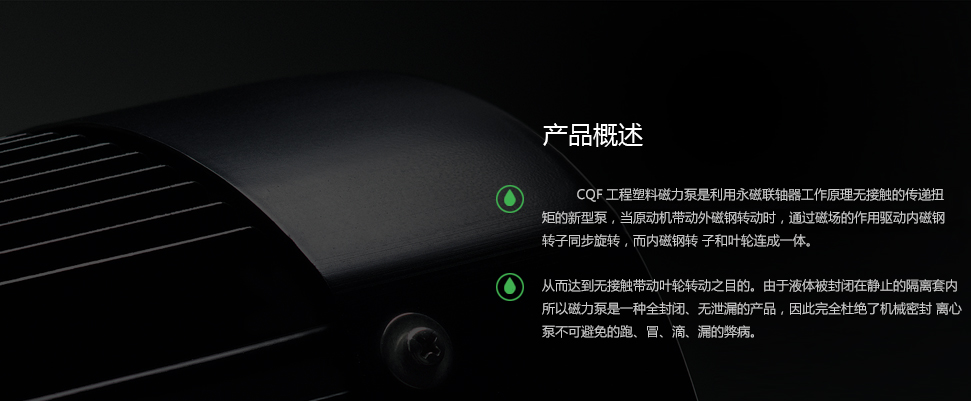 CQF系列磁力工程塑料離心泵是利用永磁聯(lián)軸器工作原理無(wú)接觸的傳遞扭矩的新型泵,當(dāng)原動(dòng)機(jī)帶動(dòng)外磁鋼轉(zhuǎn)動(dòng)時(shí),通過(guò)磁場(chǎng)的作用驅(qū)動(dòng)內(nèi)磁鋼轉(zhuǎn)子同步旋轉(zhuǎn),而內(nèi)磁鋼轉(zhuǎn) 子和葉輪連成一體,從而達(dá)到無(wú)接觸帶動(dòng)葉輪轉(zhuǎn)動(dòng)之目的。由于液體被封閉在靜止的隔離套內(nèi),所以磁力泵是一種全封閉、無(wú)泄漏的產(chǎn)品,因此完全杜絕了機(jī)械密封 離心泵不可避免的跑、冒、滴、漏的弊病。