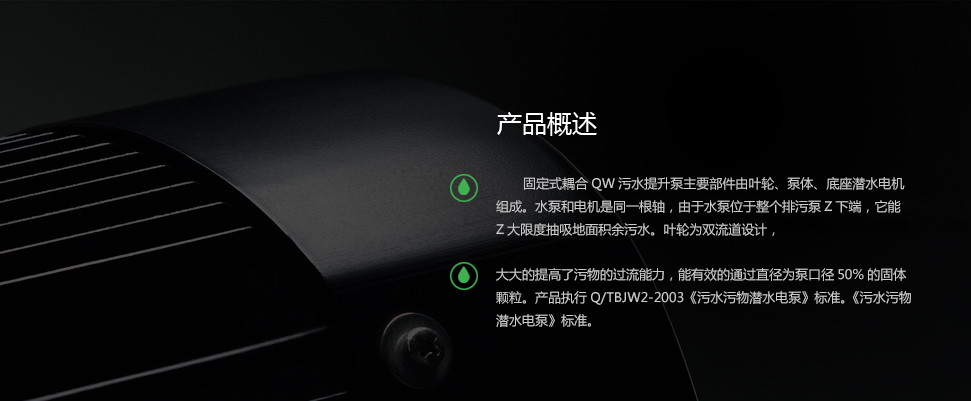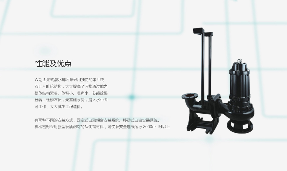 3.WQ固定式潛水排污泵整體結(jié)構(gòu)緊湊、體積小、噪聲小、節(jié)能效果顯著,檢修方便,無需建泵房,潛入水中即可工作,大大減少工程造價。