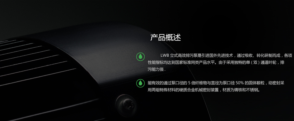 LWB高效污水節(jié)能泵適用用于工廠商業(yè)嚴(yán)重污染廢水的排放、主宅區(qū)的污水排污站、城市污水處理廠派水系統(tǒng)、人防系統(tǒng)排水站、自來(lái)水廠的給水設(shè)備、醫(yī)院、賓館的污水排放、市政工程建筑工地、礦山配套附機(jī)、農(nóng)村沼氣池、農(nóng)田灌溉等行業(yè),輸送帶顆粒的污水,污物,也可用于清水及帶弱腐蝕性介質(zhì)。
